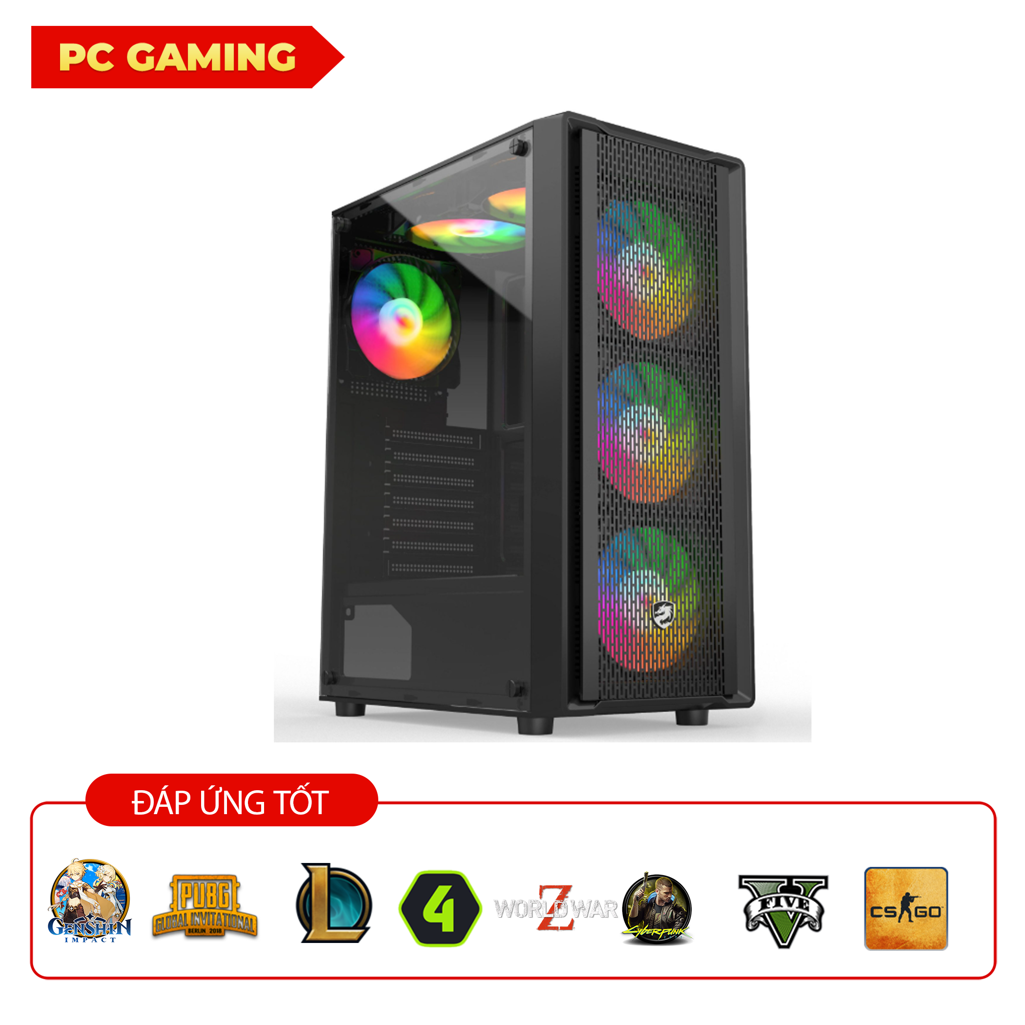 - Vỏ case: AIGO C218M Black + 4 Fan RGB Centaur CTPRO-9900 Black + hub điều khiển